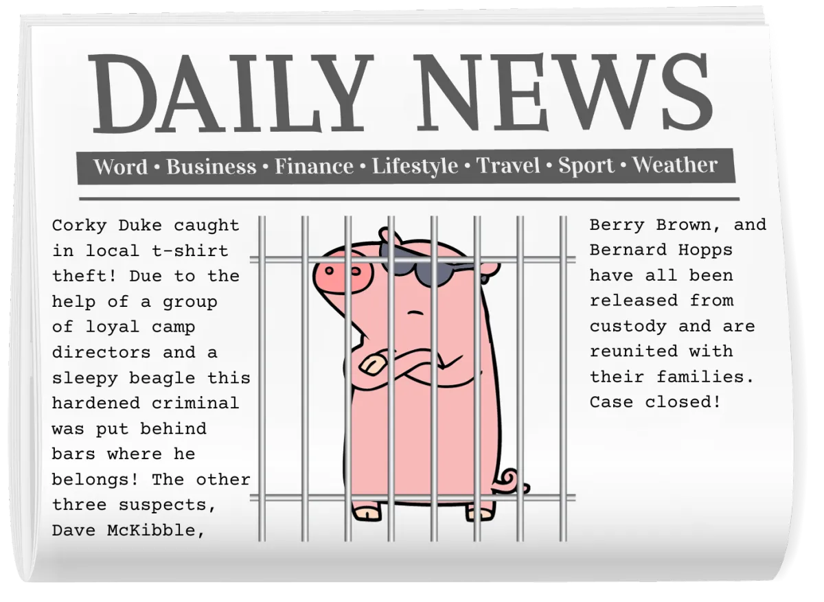 You did it! Thanks to you, we were able to figure out that Corky Duke was the one who stole the shirts! And to make things even better, we were able to locate the stolen items! So... if you made it this far, make sure to stop by Mom’s booth at one of the upcoming camp shows to get your very own shirt!